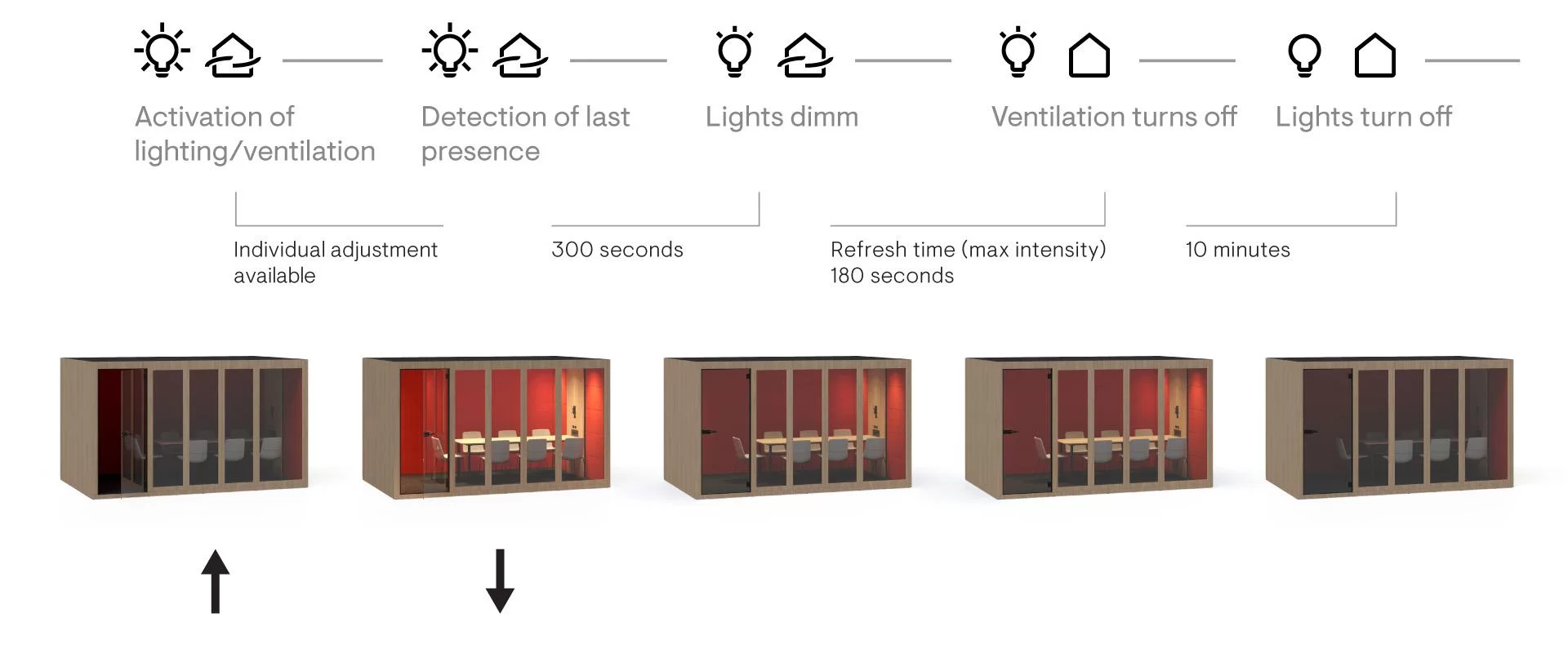 Dank der Belüftungs- und Beleuchtungslösungen bietet SILENT ROOM eine Umgebung, die die Produktivität steigert. Sechzehn leise, aber dennoch leistungsstarke Ventilatoren garantieren einen angemessenen Luftstrom, der bei längerer Nutzung den ultimativen Komfort bietet. Die Kombination der neun LED-Lampen sorgt für ein warmes und gemütliches Ambiente. Eine intelligente Steuerung ist vorab so eingestellt, dass die optimale Belüftung und Beleuchtung beibehalten werden, und ermöglicht über die Drehschalter gegebenenfalls auch eine manuelle Einstellung. Sie werden auch in der Lage sein, die allgemeinen Einstellungen der Steuerung nach Ihren Bedürfnissen zu ändern. Sobald ein Mitarbeiter den SILENT ROOM verlässt, wird automatisch eine intensive Belüftung eingeschaltet, um den Raum für den nächsten Nutzer vorzubereiten. Dieses akustische Möbelstück hilft auch beim Energiesparen, da es die Lichter automatisch dimmt, wenn sich niemand im Raum befindet, und nach einer gewissen Zeit ganz ausschaltet.