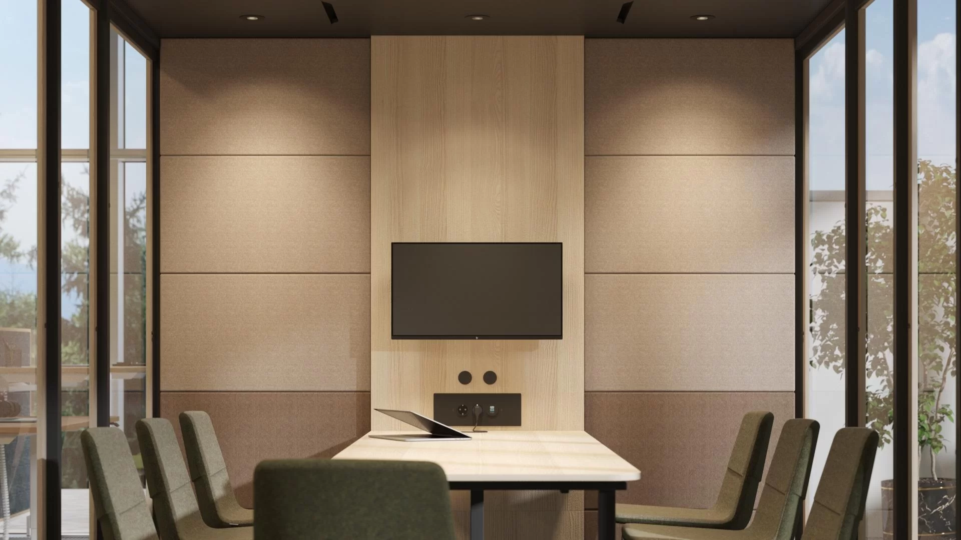 Die akustische SILENT ROOM-Kabine gewährleistet mit ihrem speziellen Design die richtige Schalldämmung, d.h. sie blockiert sowohl den eingehenden als auch den ausgehenden Lärm. Die akustischen Innenwände verfügen über hervorragende Schalldämmungseigenschaften, die dazu beitragen, den Nachhall im Raum zu beseitigen, so dass die Nutzer eine zwanglose und angenehme Atmosphäre genießen können. Mit ihrem geringen Betriebsgeräusch sind die Ventilatoren der akustischen Kabinen so leise wie das Rauschen von Blättern. Dadurch werden Benutzer bei hochkonzentrierten Aufgaben nicht abgelenkt. Die Modelle mit gepolsterten Außenwänden sind außerdem so entworfen, dass sie Lärm absorbieren, was sich positiv auf die allgemeine Akustik des gesamten Bürobereichs auswirkt.