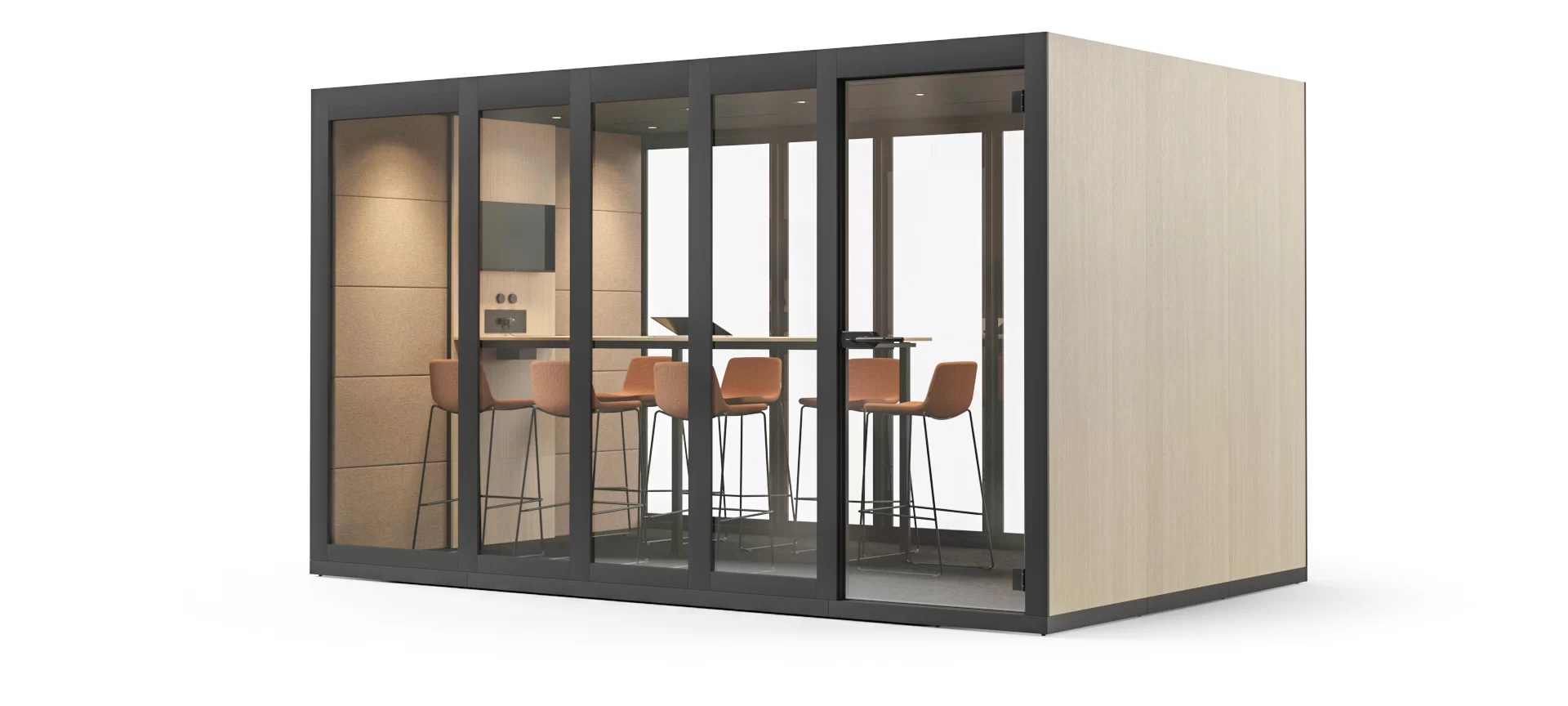 Diese geräumige akustische Kabine für vier Personen bietet ein hohes Komfortniveau, ohne Ihre Bewegungsfreiheit einzuschränken. Der Bereich des SILENT ROOM XL ermöglicht es Ihnen, eine individuell angepasste Umgebung zu gestalten, die die Bedürfnisse Ihres Teams am besten erfüllt. Wählen Sie für Ihre formellen Teambesprechungen oder wichtigen Geschäftstreffen einen normalen Tisch oder einen Stehtisch mit Stühlen. Ein Kaffeetisch und bequeme Besucherstühle oder Sessel eignen sich dagegen perfekt für Ihre zwanglosen Teambesprechungen und Workshops mit einer entspannteren Atmosphäre. Sie können sicher sein, dass Sie in der Lage sein werden, ein wichtiges Gespräch oder eine Präsentation auch dann fortsetzen zu können, wenn der Akku Ihres Geräts leer ist. Für den Komfort der Benutzer ist der Raum mit einem Netzteil ausgestattet (mit verschiedenen Anschlüssen erhältlich).