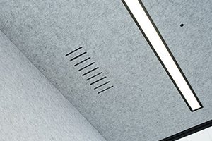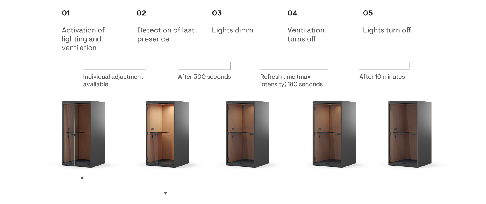 Sobald ein Mitarbeiter den SONUS S verlässt, wird automatisch eine intensive Belüftung eingeschaltet, um den Raum für den nächsten Nutzer vorzubereiten. Dieses akustische Möbelstück hilft auch beim Energiesparen, da es die Lichter automatisch dimmt, wenn sich niemand im Raum befindet, und nach einer gewissen Zeit ganz ausschaltet.