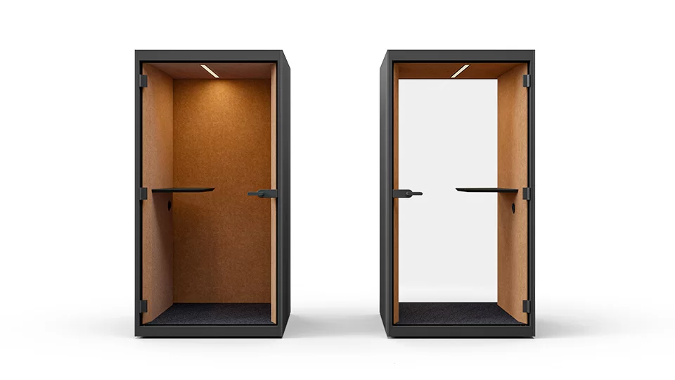 Die beiden Typen der SONUS S Akustikkabinen können in unterschiedlichen Situationen eingesetzt werden. Entscheiden Sie sich für eine Konfiguration mit einer Glasrückwand für mehr Transparenz. Ein Glaseinsatz in der Rückwand lässt nicht nur mehr Licht in die Kabine, sondern bewahrt auch die Sicht in den dahinter liegenden Bereich, was sie zur idealen Option macht, um sie in Großraumbüros, neben Glastrennwänden oder sogar neben Fenstern aufzustellen. Eine Akustikkabine mit einer Rückwand aus PET-Filz ist für die Platzierung an einer Wand geeignet. Beide Optionen der Akustikkabinen bieten die gleiche Schalldämmklasse: B.