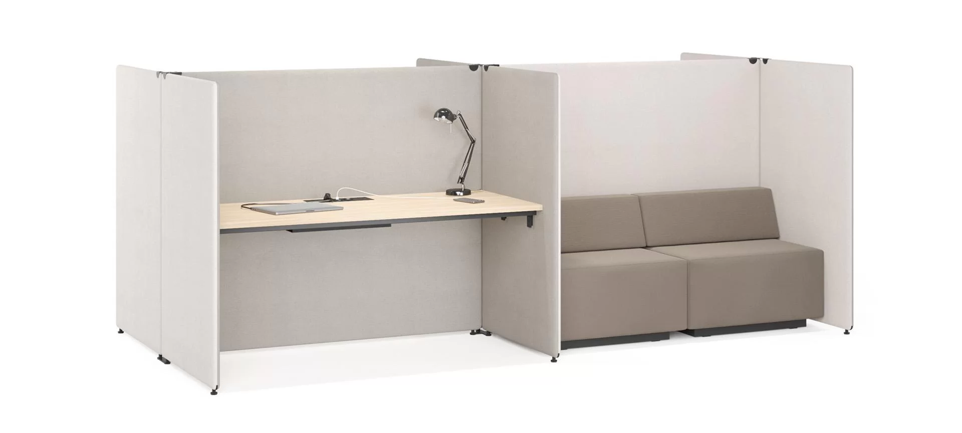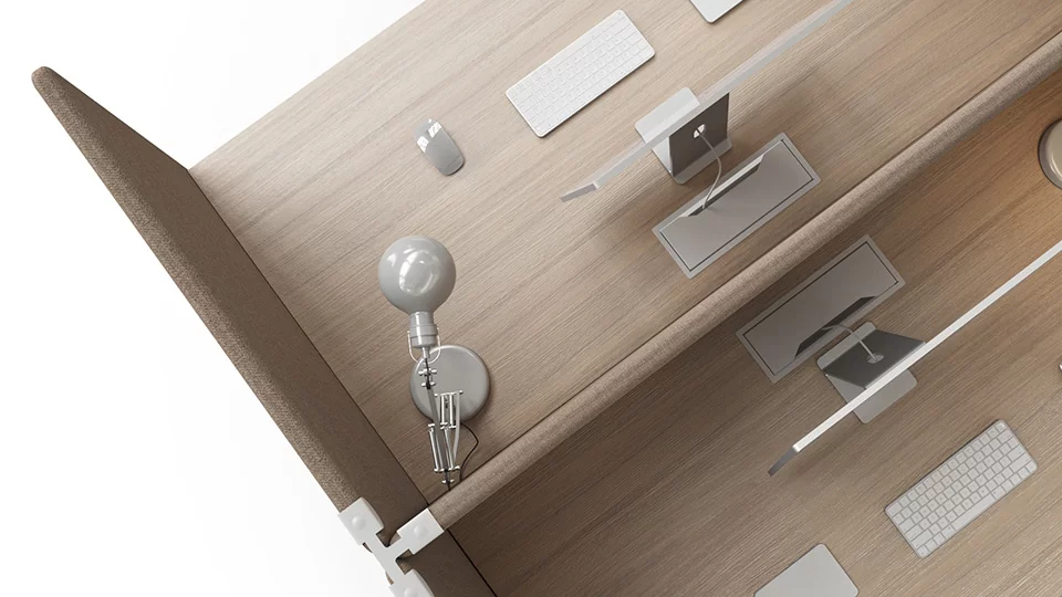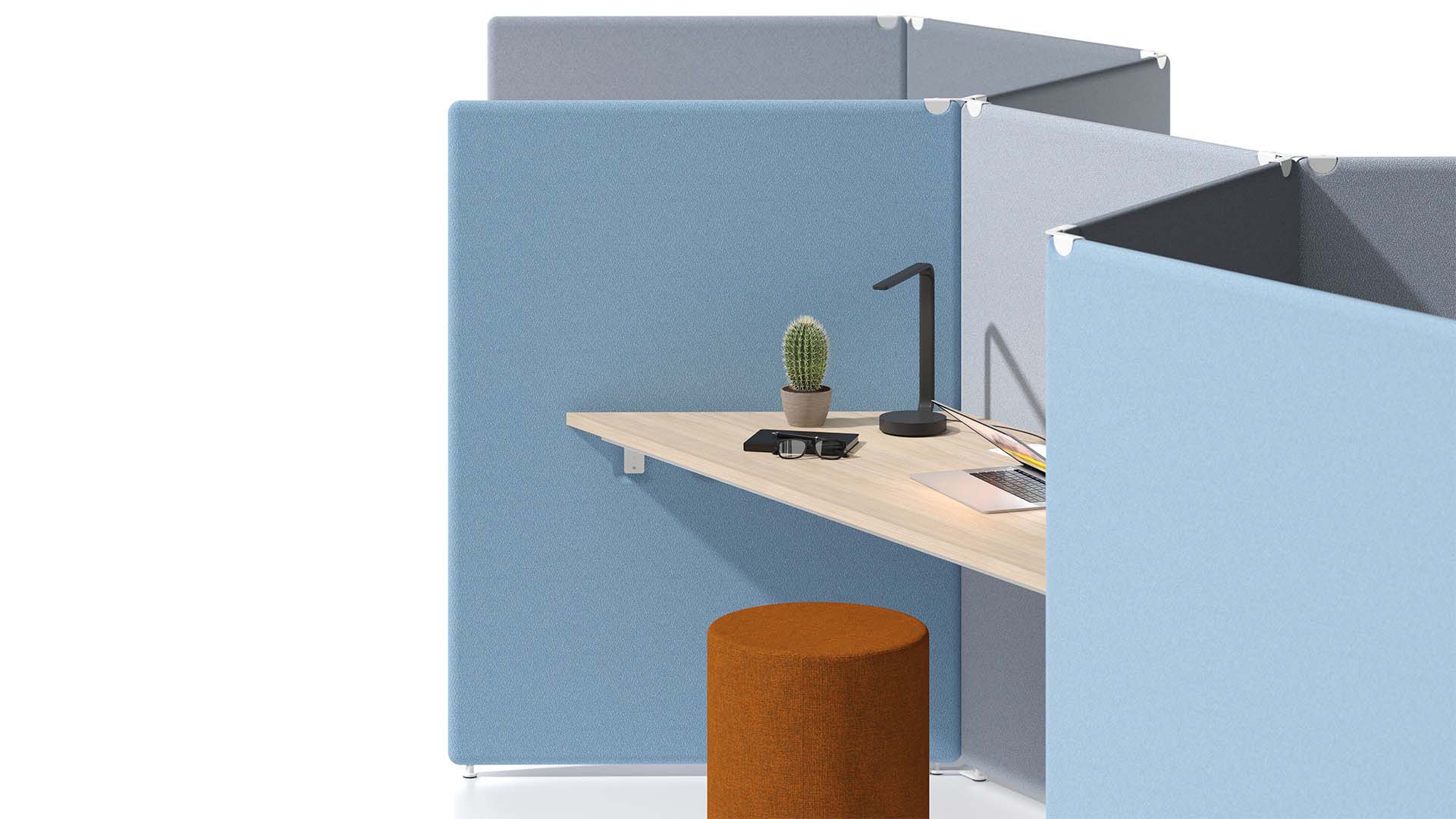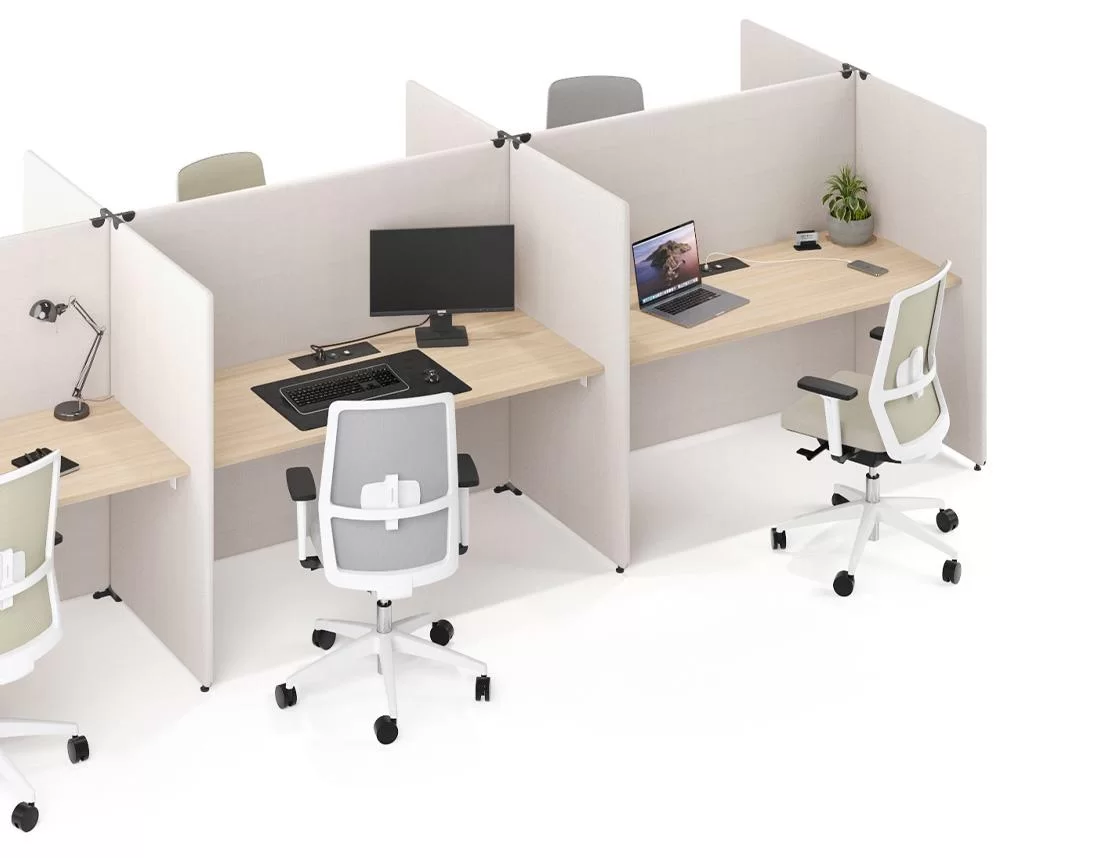 Viele verschiedene Verbindungen der akustisch wirksamen Sichtblenden erlauben Ihnen verschiedene Strukturen zu bauen und geben Ihnen die Freiheit so gut wie jeden gewünschten Arbeitsplatz zu kreieren.