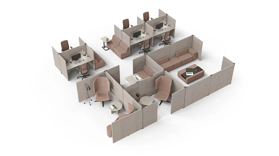 Eine grosse Bandbreite an Anwendungsmöglichkeiten und Konfigurationen dieser modularen akustisch wirksamen Sichtblenden erlaubt es Ihnen, Ihre Möbel an verschiedene Büronutzungsbedürfnisse und Arbeitssituationen anzupassen. Vom privaten Mini-Zimmer für bessere Konzentration bis zu Bereichen für Teamwork bietet dieses System einen komfortablen Arbeitsplatz, erlaubt Ihnen sich vom Umgebungslärm zu entfernen und öffnet neue Möglichkeiten als „Büro-im-Büro“.