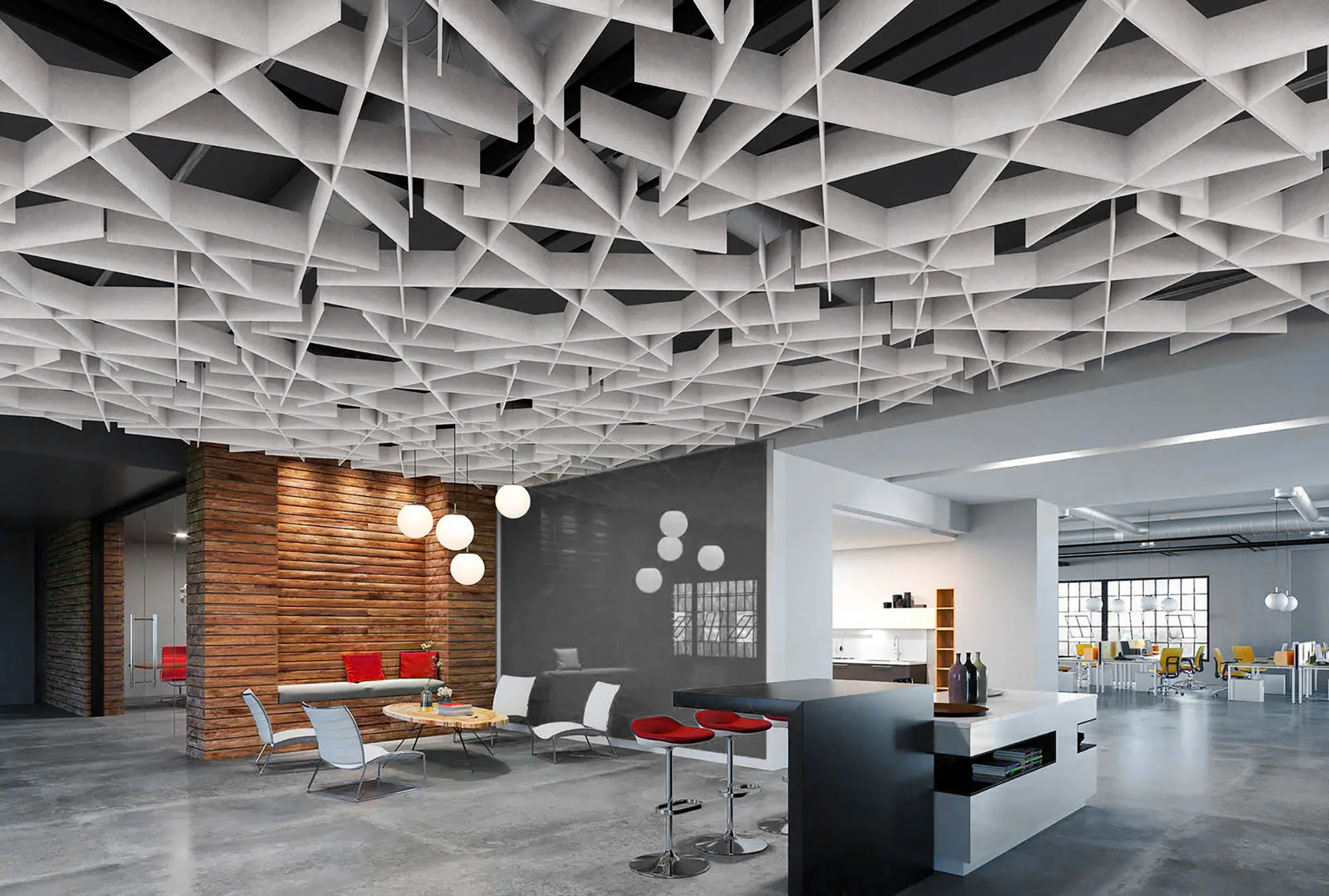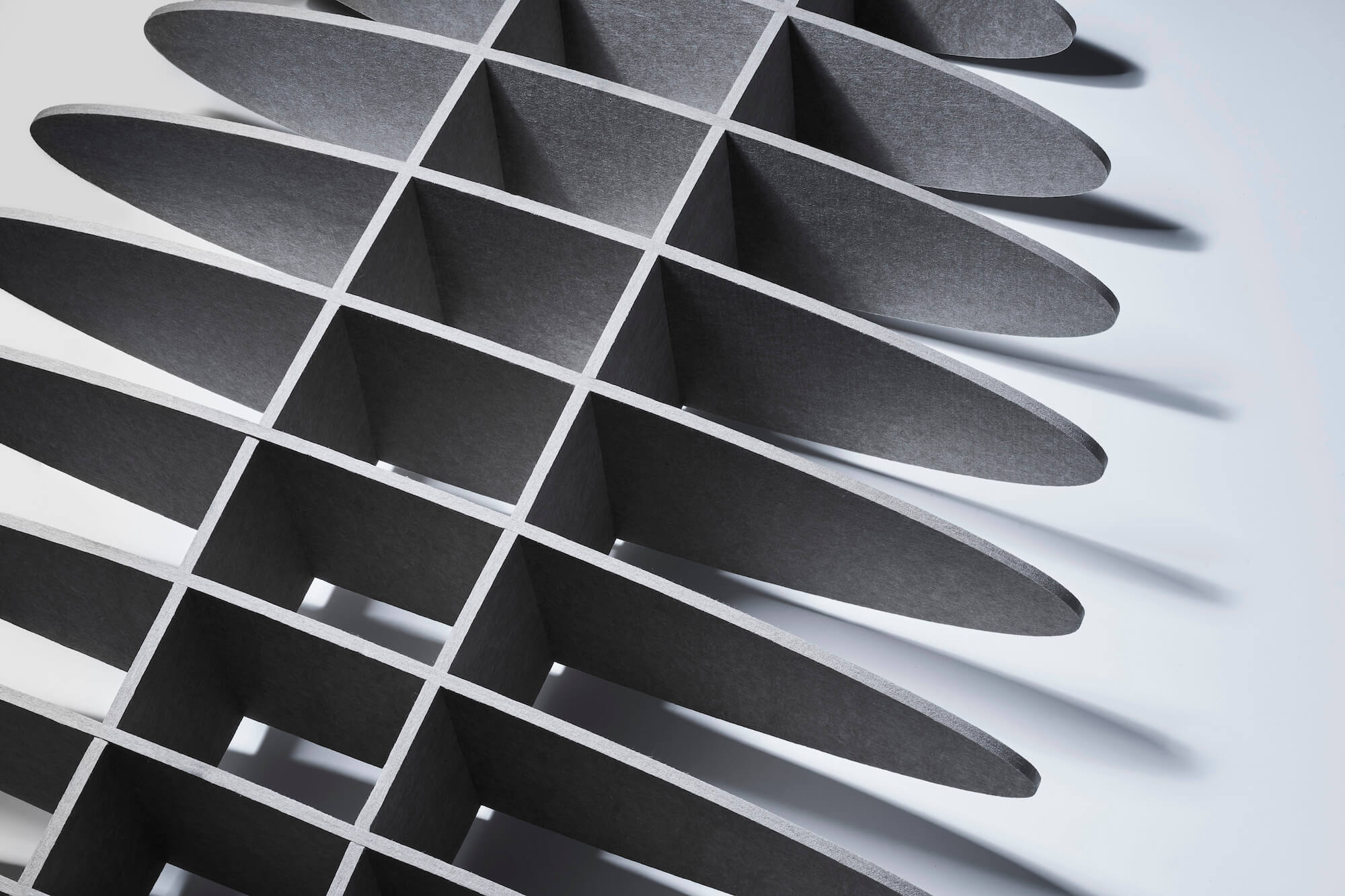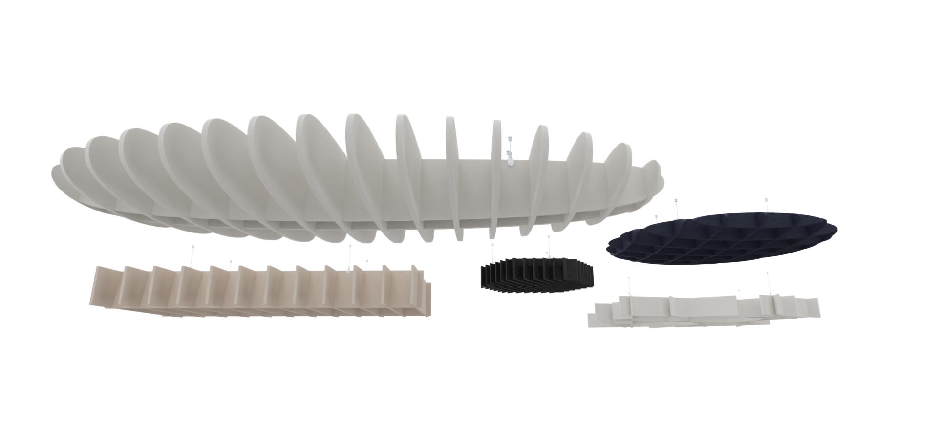 Das suonoCLOUD ist ein abgehängtes Akustik-Deckenelement mit ineinandergreifender, dreidimensionaler Lamellenstruktur.