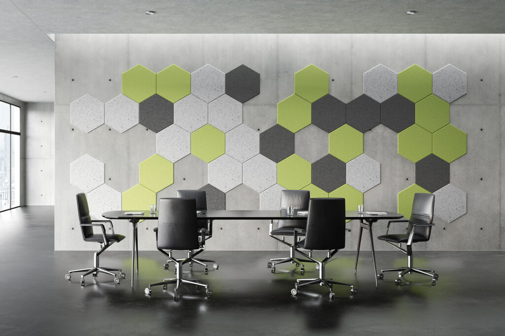 Die suonoTILES sind frei kombinierbare Wandschallabsorber in geometrischen Formen zur Gestaltung einzelner Wände oder ganzer Raumabschnitte.