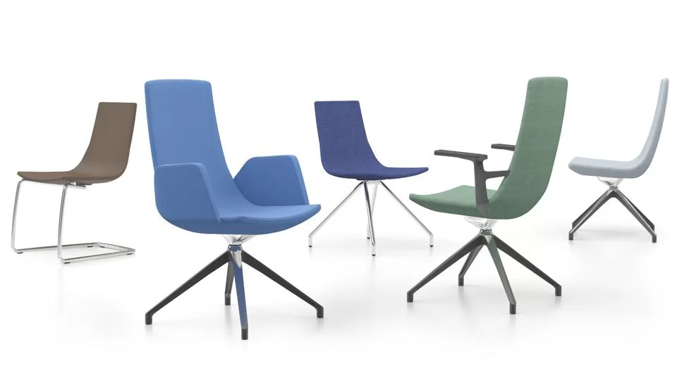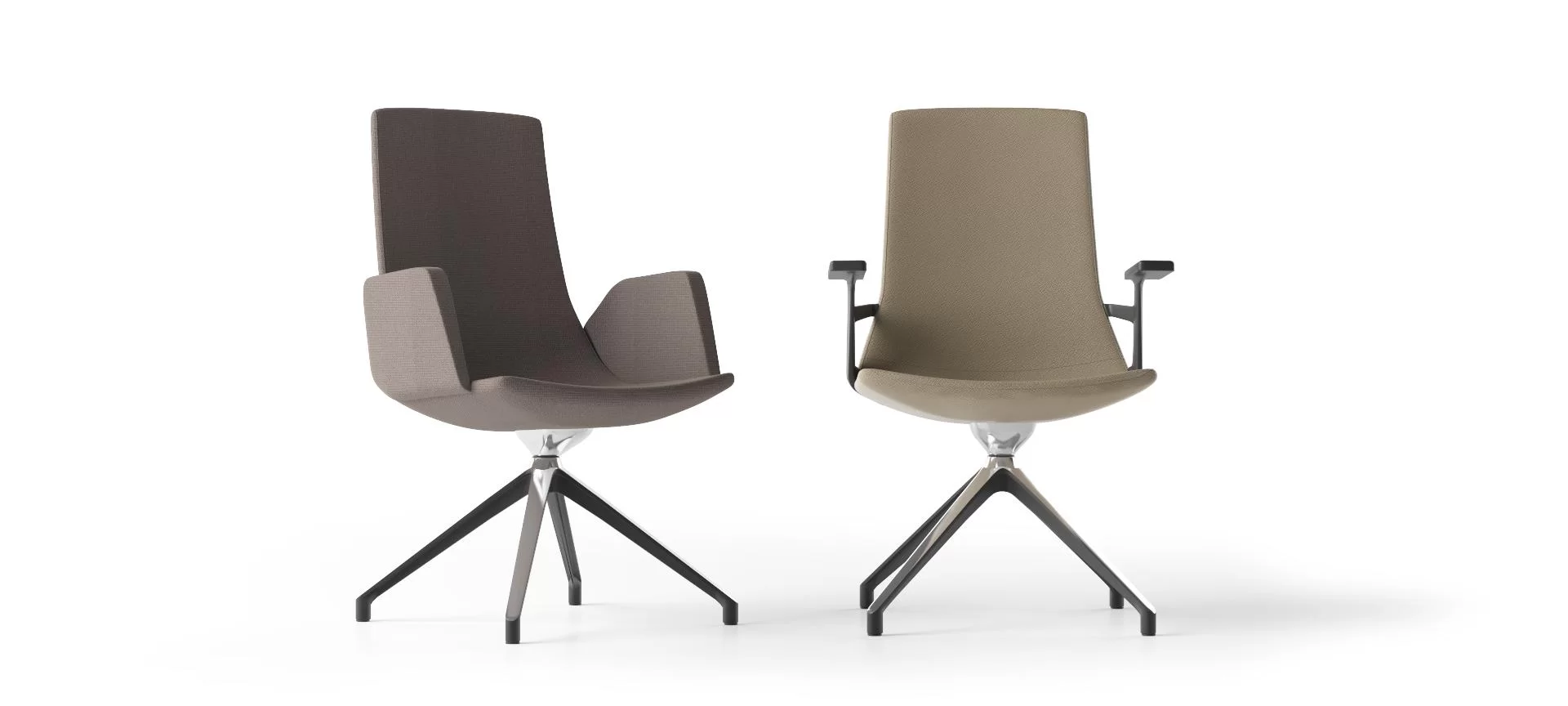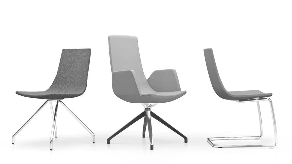 Die Besucherstühle NORTH CAPE bieten vier Untergestell-Optionen, die Sie an unterschiedliche Bedürfnisse und Bürobereiche anpassen können. Das drehbare 4-Fuß-Gestell aus poliertem Aluminium verleiht dem Stuhl Eleganz und Solidität. Stühle mit dieser Art von Gestell schaffen ein repräsentatives Bild und können die Empfangs- sowie wichtige Besprechungsbereiche dekorieren. Stühle mit einem Pyramidenbasis, Freischwinger- oder einem einfachen 4-Fuß-Gestell können bequem in kleineren und gemütlicheren Besprechungsräumen verwendet werden.