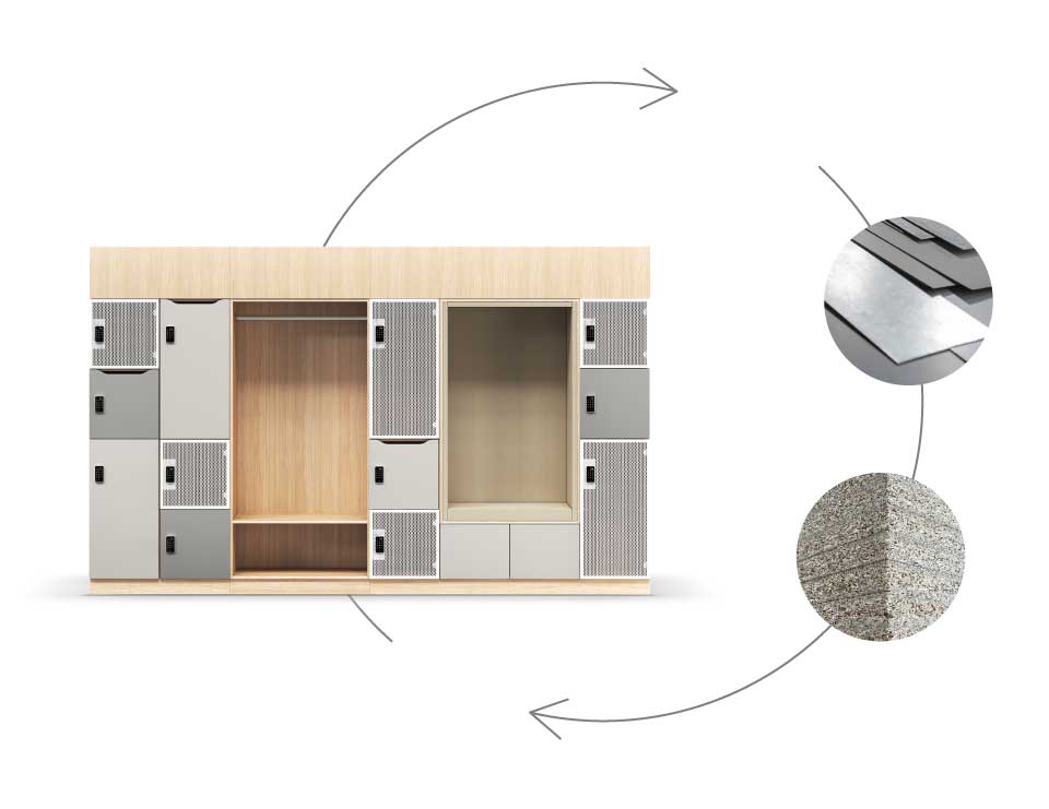 Wenn die Schließfachschränke jedoch uninteressant werden, können wir ein nachhaltiges End of Life-Management für die Produkte sicherstellen, indem wir sie demontieren, sortieren und ihre Teile recyceln. Ihre Recyclingquote beträgt 97 %.