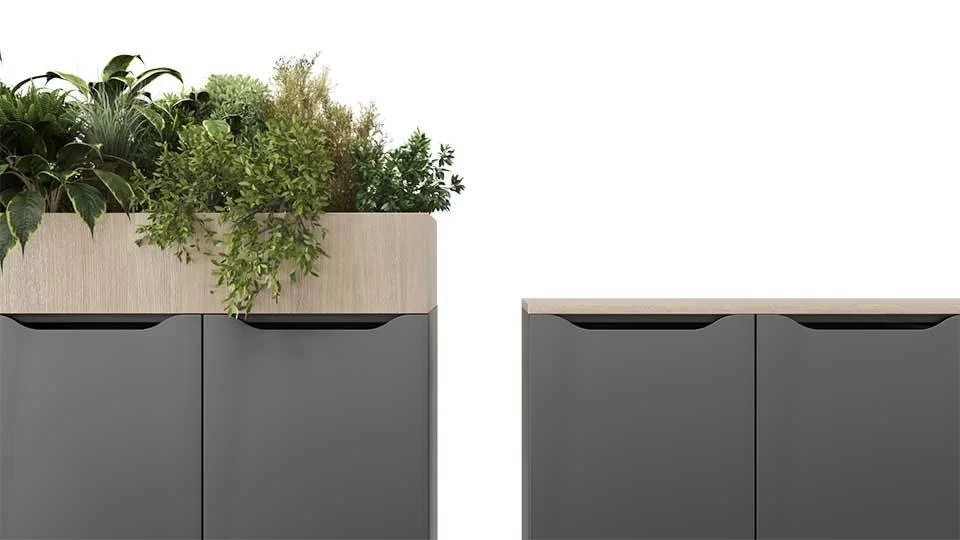 Um Ihre Schließfachschrankkombination zu vervollständigen, können Sie zwischen zwei verschiedenen Größen von Pflanzkästen wählen, in denen Pflanzen nicht nur die Raumluftqualität verbessern, sondern auch für eine gemütliche Atmosphäre sorgen. Sie können auch die minimalistische Variante mit einem oberen Paneel wählen, das ein harmonisches Aussehen gewährleistet.