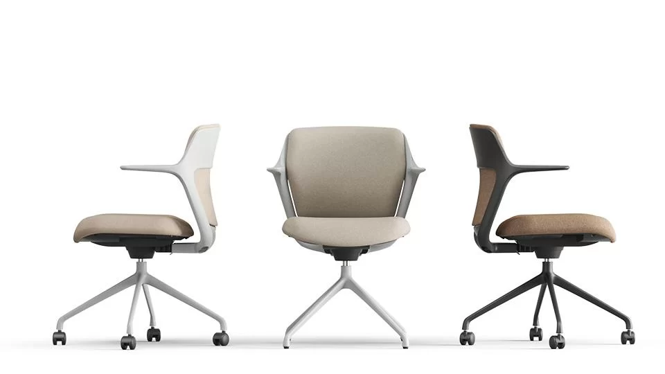 Der Rahmen des OFY-Stuhls ist in zwei Farben erhältlich – schwarz und grau. Er kann mit einer gleichfarbigen Basis kombiniert werden und präsentiert sich zusammen mit integrierten oder festen Armlehnen in einem ansprechenden und eleganten Design. Dadurch erhält der Stuhl ein makelloses Aussehen. Außerdem können Sie durch die Wahl der Stoffe für die Polsterung jede beliebige Stimmung erzeugen und die Stühle mit anderen Polstermöbeln im Büro kombinieren, wie z. B. Schreibtischtrennwänden und weichen Möbeln.