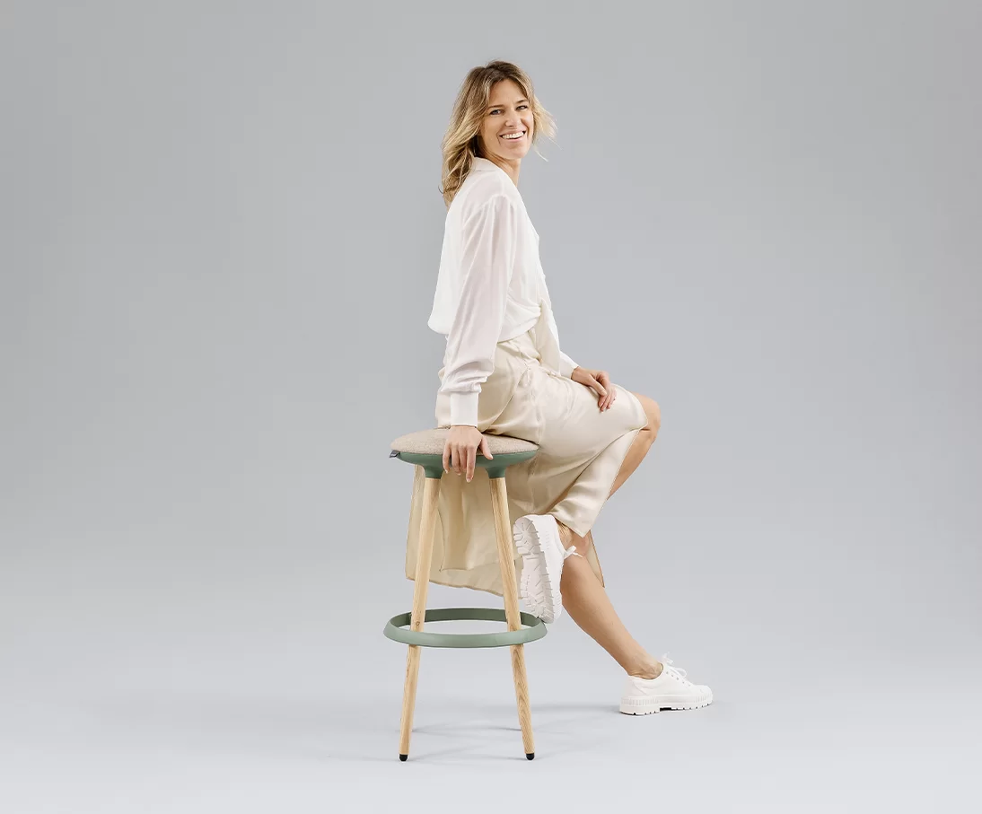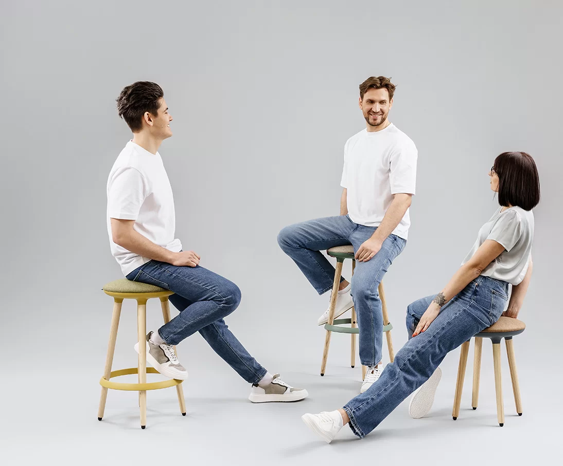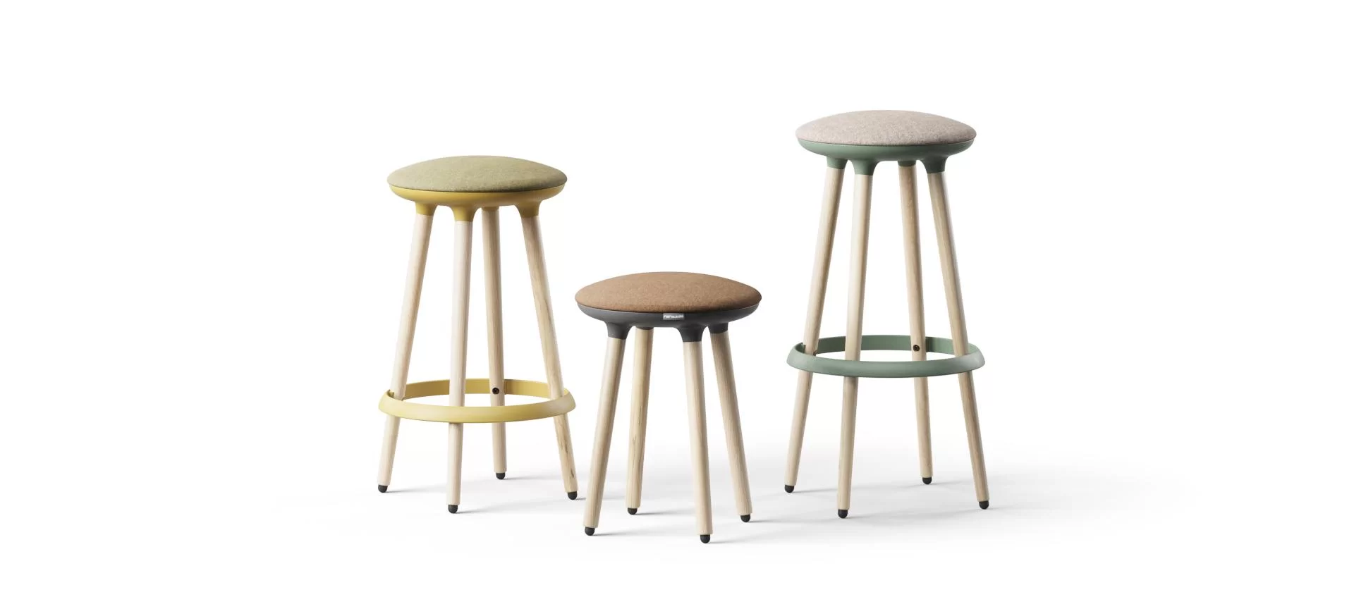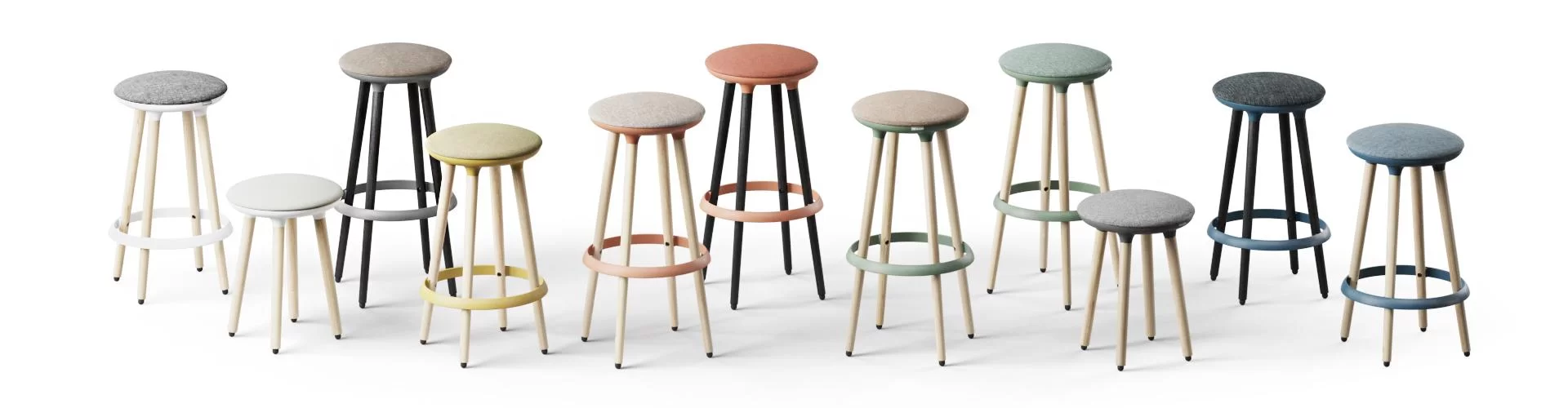 Die Kollektion besteht aus Hockern in drei Höhen: einem Hochhocker mit 790 mm, einem mittelhohen Hocker mit 690 mm und einem Hocker mit 500 mm. Wenn Sie sie in verschiedenen Bürobereichen verwenden, können Sie einen einheitlichen Stil beibehalten.