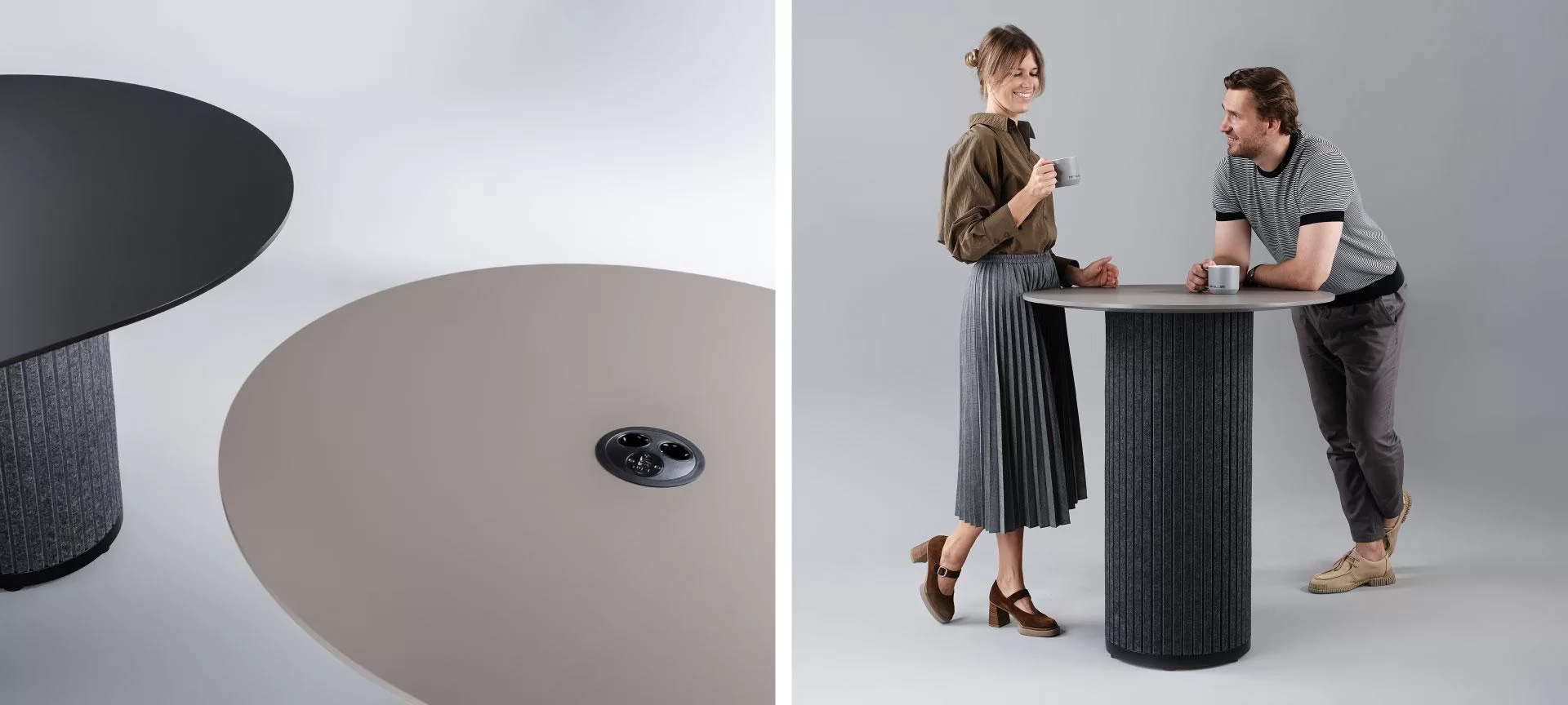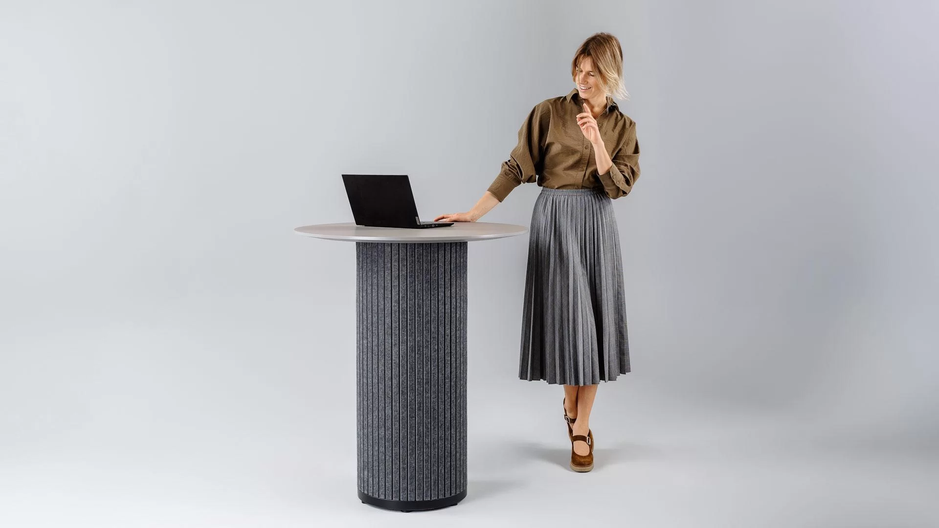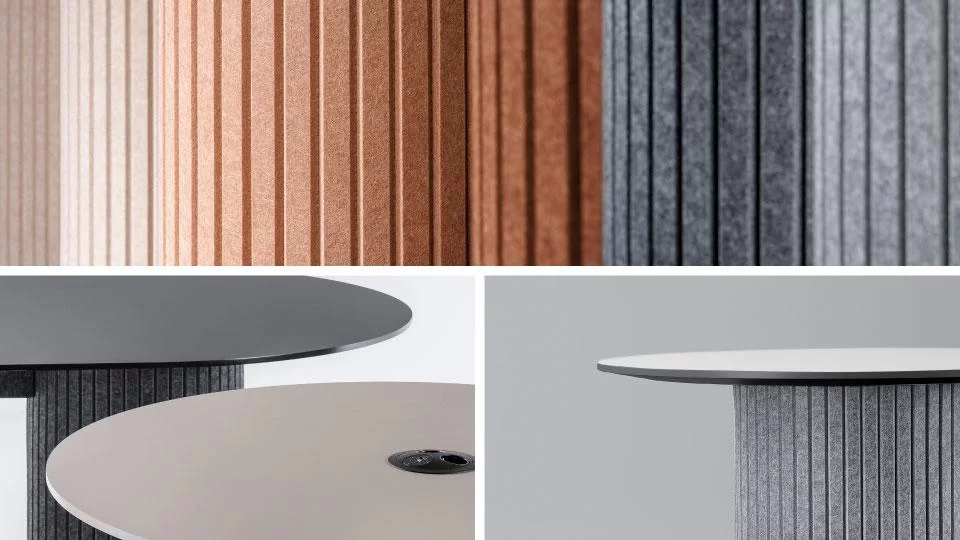 PET-Filz hat akustische Eigenschaften. Die poröse Oberfläche absorbiert den Schall, während die vertikalen Aussparungen einen Teil der Schallwellen eliminieren. Wir empfehlen, diese Tische mit den PARTHOS-Akustiksäulen zu kombinieren. Sie sorgen nicht nur für ein besseres akustisches Umfeld, sondern schaffen auch stilistisch harmonische Innenbereiche für Besprechungen, Entspannung und andere Zonen.