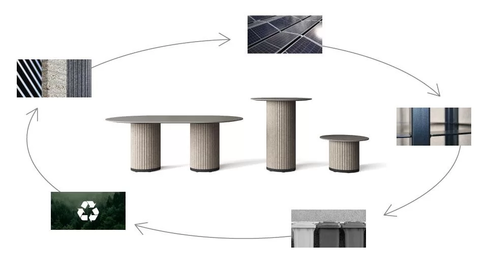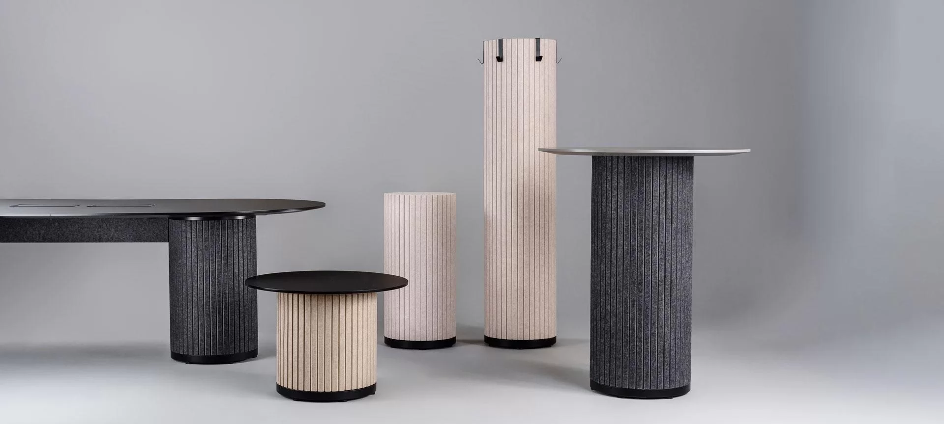 Das wichtigste Designelement der Möbel aus dieser Kollektion ist eine skulpturale zylinderförmige Säule, die in der Architektur seit jeher Stärke und Stabilität symbolisiert. Mit einer modernen Interpretation wird dieses Element der klassischen Architektur zum verbindenden und unverwechselbaren Designakzent der PARTHOS-Tischkollektion. Die zylinderförmige Säule ist mit PET-Filz überzogen, dessen Strukturmuster mit vertikalen Linien die Anspielung auf das Element der klassischen Architektur noch weiter hervorhebt.