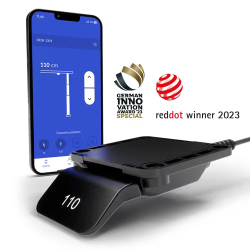 Die neue Taster Serie wurde mit modernem Designdenken entwickelt und besitzt eine Form, die das Design jedes Sitz-Steh-Tischs aufwertet. Der Taster ist in zwei Ausführungen erhältlich, einer einfachen Version mit Auf/Ab-Funktion und einer erweiterten Version mit Display und Memory.